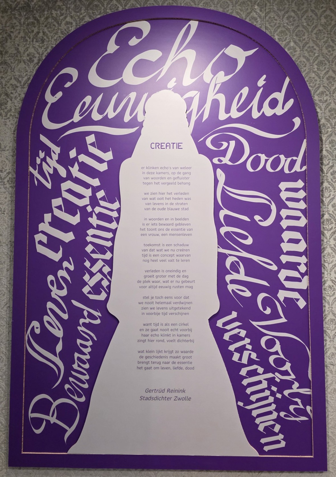 In de ruimte van Gesina in ANNO Stadsmuseum Zwolle hangt het gedicht ‘Creatie’. Dit gedicht is geschreven door de Zwolse Stadsdichter Gertrüd Reinink. Voor het gedicht ‘Creatie’ liet Gertrüd zich inspireren door het verhaal van Gesina ter Borch. Ze las over haar leven en bezocht de tentoonstellingen in ANNO, Museum de Fundatie en het Academiehuis Grote Kerk.